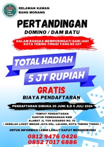 Pertandingan Domino/Dam Batu yang memperingati HUT Kota Tebing Tinggi yang ke-107 sekaligus memperebutkan hadiah dari Kawan Bang Monang (KBM) pada Sabtu 07Juli 2024 dari pukul 20:00 Wib sampai selesai.