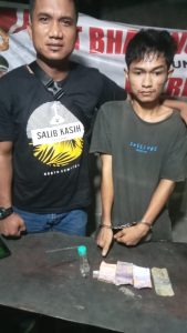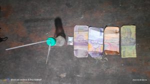 Saat dilakukan penggeledahan, ditemukan sejumlah barang bukti di lokasi, seperti 1 (satu) buah Plastik Klip transparan berukuran Sedang yang berisikan diduga Narkotika Jenis Shabu, 1 (satu) buah bong alat hisap narkotika jenis shabu yang dirakit dari botol lasegar dan Uang tunai sebesar Rp 26.000 (dua puluh enam ribu rupiah).