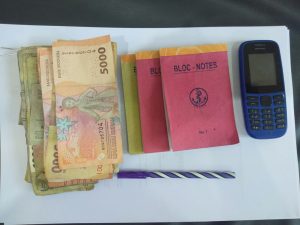 Uang tunai sebesar Rp 142.000,-, 1 unit handphone Nokia warna biru berisi catatan angka tebakan, 3 buah blok notes,1 buah pulpen.